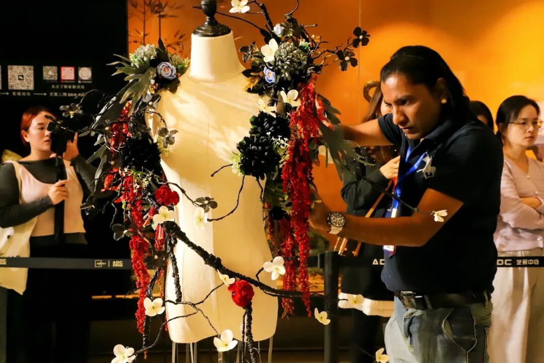 与此同时,人体花艺赛区则上演着身体与自然的共生共舞。模特化身为流动的“花架”,选手们以人体曲线为灵感,将花卉、枝叶与创新材料转化为颈饰、头饰与身体装饰,创作出极具视觉冲击力的可穿戴艺术。