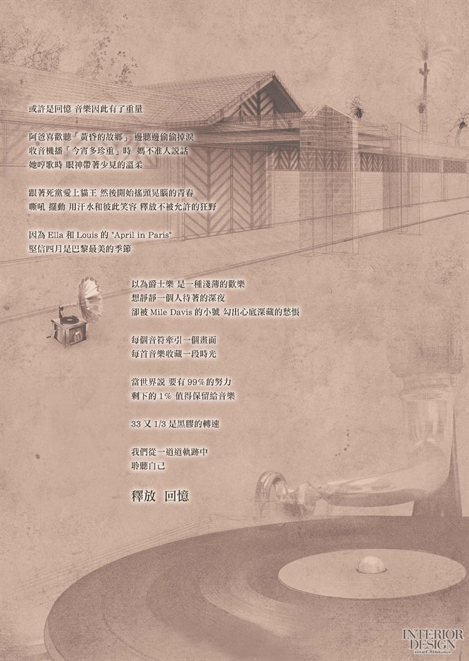 我们尊重历史,以建物整体结构及外观完整修复的方式,再设定乡村与工业混搭的风格,并运用部分原场地材料进行再生利用,原木横梁、砖造墙柱及复古地砖展现历史建筑优雅的姿态,温润的空间展现出质朴的氛围,置入黑胶唱片音乐等主题,成为餐饮、酒吧、展演、音乐赏析的多元空间。 我们希望能够结合当地社区及大学,甚至更多的团体,教室及舞台的部分可提供给他们作为练习及表演的场所,把这样的文化连结在一起碰撞出新的火花。 期望让来访到此的每一个人,在这令人放松身心的空间中,感受着时光的美好过往,同时能够创造出现今的美好记忆,成为一处新的世外桃源。 在这里,我们规划了几个区块: 历史展示区—让大家可以充分了解这里的历史与文化。