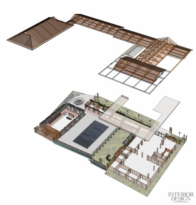 设计用材:杉木、陶制双沟瓦、非洲胡桃木、火头砖、花砖、水泥粉光、大理石、镀钛钢板、铁件